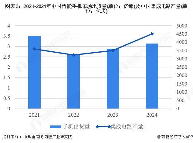 手机作为中国消费电子市场最核心的应用场景之一,其出货量波动直接影响核心芯片需求。以中国通信院历年发布的中国智能手机出货量为例,进一步分析中国消费电子市场与中国集成电路行业的关系。2021年出货量约3.5亿部,2022年受疫情扰乱消费周期、半导体供应链紧张等原因,市场调整影智能手机出货量降至约2.6亿部,2023年回升至近2.9亿部,2024年进一步增至约3.1亿部。市场经历阶段性波动后的逐步复苏,其走势与集成电路产量趋势一致,国产品牌与5G机型的高占比成为支撑出货量回升的重要动力,凸显了消费电子芯片作为我国集成电路产业核心应用领域的稳固地位与增长活力。同时,后期集成电路增幅大于手机出货量,也说明了更多新兴市场需求的增长对集成电路需求端产生了一定冲击,如新能源汽车、AI服务器、物联网等。