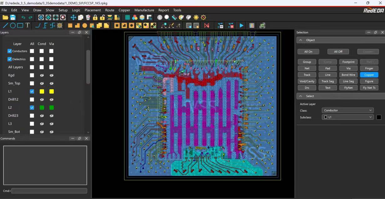 作为企业自研 EDA 平台的核心产品,RedPKG 是一款专注于芯片封装设计的全流程 EDA 软件,主要应用于芯片开发、封装设计等 IC 设计和生产领域,为封装阶段提供理论设计和物理设计双重支持。软件核心功能涵盖 DIE PAD 参数设置、Ball 参数设置、Net In 导入、布局、布线、加工数据输出等,精度可支持纳米级别,能够满足 FC、WB 等多种类型封装设计需求。